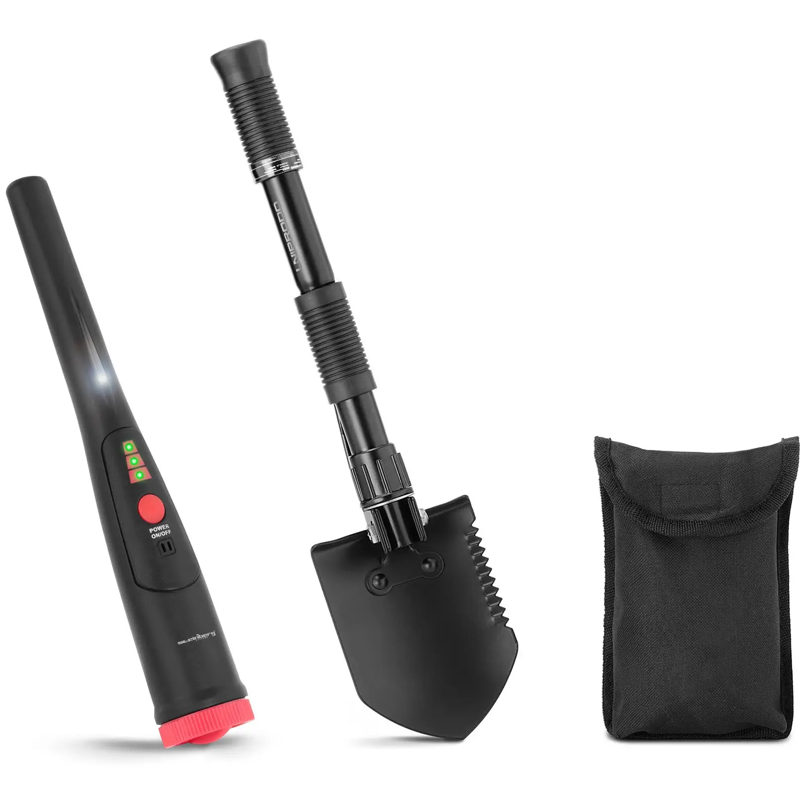 Schattenjager of beveiliger, spannende hobby of baan? Met de Pinpointer metaaldetector SBS-MD-4 combineert u beide! Het belangrijkste bij een schattenjacht is een metaaldetector. Ga op jacht naar juwelen, goud, zilver, oude relikwieën of andere metalen elementen met magnetische of niet-magnetische eigenschappen. Detecteren en zoeken in het donker is ook geen probleem, want de metaaldetector heeft een zaklampfunctie. Het is ook perfect voor de beveiligingsindustrie, of het nu gaat om luchthavens, stadions of concerten. De metaaldetector detecteert betrouwbaar messen en andere wapens zonder bij elke doorboring onmiddellijk alarm te slaan. De set bevat ook een opvouwbare spade met pikhouweel en zaag.