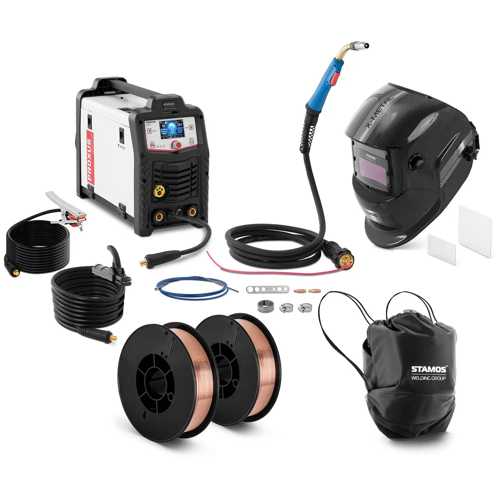 Wilt u snel lasfuncties veranderen en nauwkeurige instellingen bereiken? Gebruik dan het moderne MIG MAG lasapparaat met een krachtige IGBT omvormer en een duidelijk display met de voorgeïnstalleerde talen Engels, Duits, Frans en Zweeds. Met behulp van het LCD-scherm en een paar knoppen kunt u snel en eenvoudig optimale waarden bereiken voor de meest uiteenlopende laswerkzaamheden. U kunt hem net zo goed gebruiken voor elektrode lassen, voor TIG Liftarc of als u last met draad zonder gas voor de FCAW lasmethode. Uw veiligheid wordt gegarandeerd door de X-Metal lashelm, die gemaakt is van de onverwoestbare TECAMID 66 materiaalsamenstelling. Dankzij het grote gezichtsveld ziet u alle details nog nauwkeuriger. Wil je meteen aan de slag? Gebruik dan de twee rollen van 5 kg voor staal met een diameter van 0,8 mm en 1 mm uit deze set!